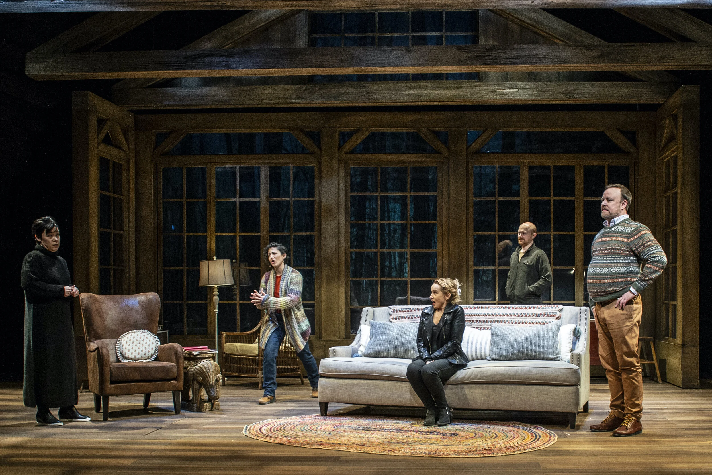 From left to right: Anna Ishida as Jools, Alyssa Keegan as Teresa, Jennifer Dundas as Allie, Jeff Biehl as Jim, and Tom Story as Andrew. (Courtesy of Woolly Mammoth Theatre Company. Production photograph by Teresa Castracane.)