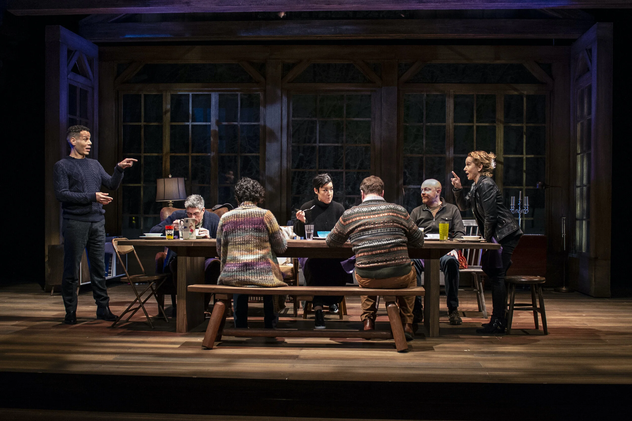 The set design is artful and austere, giving us the bare bones of this old farmhouse. At the back of the set, huge windows hint at the world outside. I particularly like the way the snowstorm flickers on the windows so that it feels palpable: we get the sense of being trapped. Deceptively simple staging techniques allow two stories to play out in the same space: lighting shifts, the liberal friends freeze, and then the black son or the white father will begin talking, sharing a memory of the boy’s coming of age. We’re also treated to a couple of big scene changes, in which the set shifts rapidly and seamlessly, so that we see into new worlds, perhaps worlds that only exist within the characters’ imaginations. The structure is loose and unconstrained: it feels like this night could go on forever. At over two and a half hours, this is a long play, and I did feel it dragging towards the end. I’m sure that the slow pacing is deliberate, but if it were tightened and shortened, the play would be stronger.