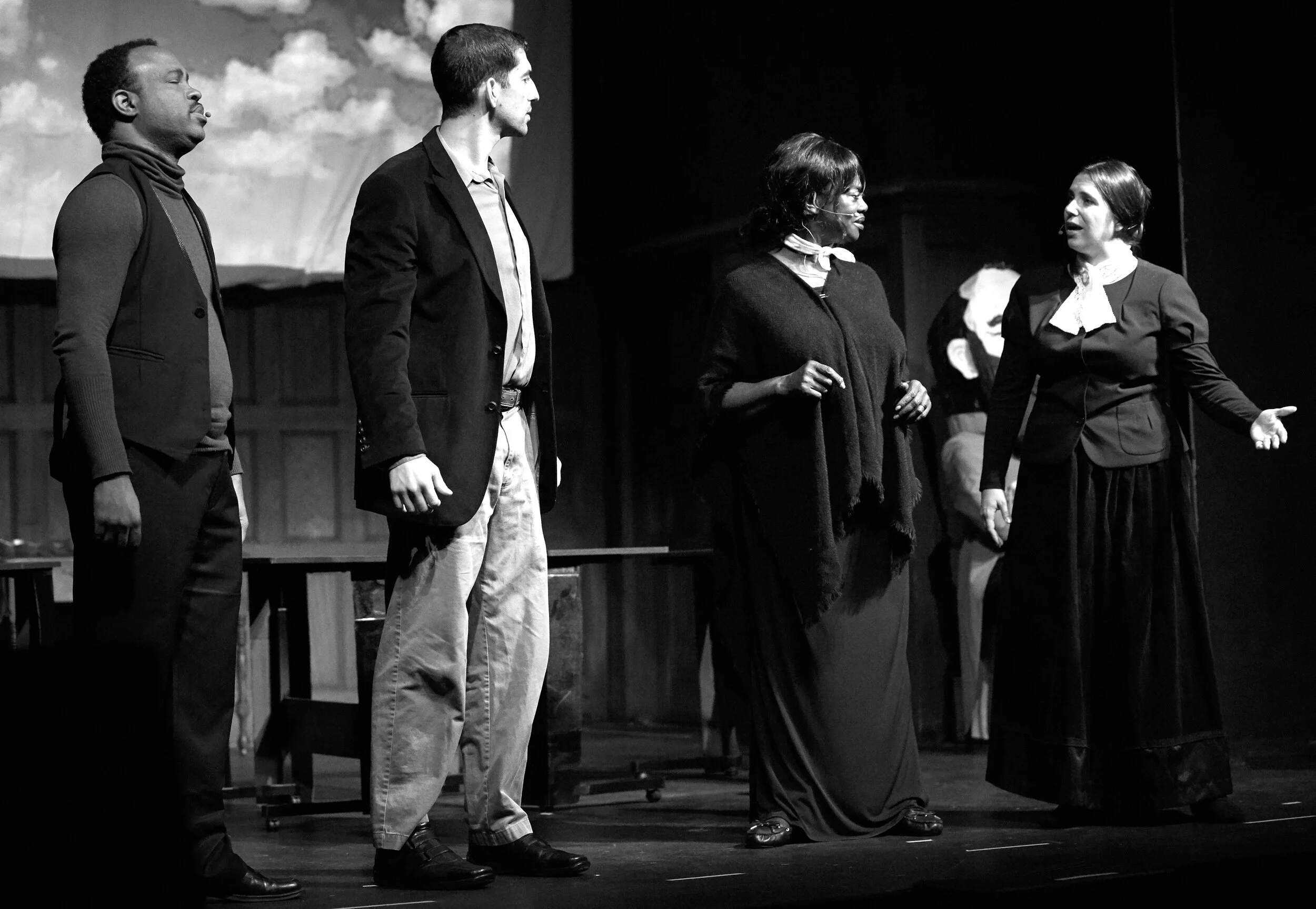 The Moment Is Now, performed in 2019. From left to right: Darryl Moch as Isaac Myers; Ari Jacobson as William Sylvis; Julia Nixon as Frances Harper; Jenna Stein as Susan B Anthony. Photograph by Sean Scheidt.