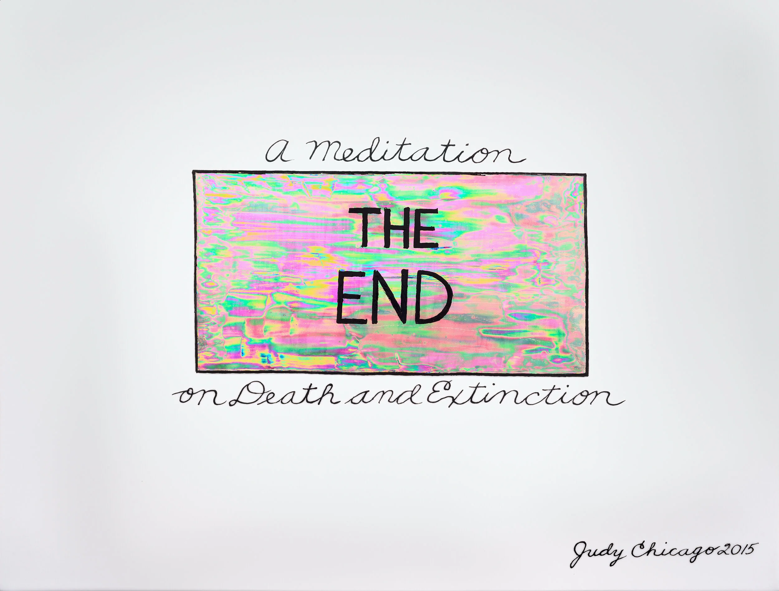Judy Chicago, Title Panel: The End: A Meditation on Death and Extinction, 2015; China paint, pen work, and luster on porcelain, 12 x 16 in.; Courtesy of the artist; Salon 94, New York; and Jessica Silverman Gallery, San Francisco; © Judy Chicago/Artists Rights Society (ARS), New York; Photo © Donald Woodman/ARS, NY.