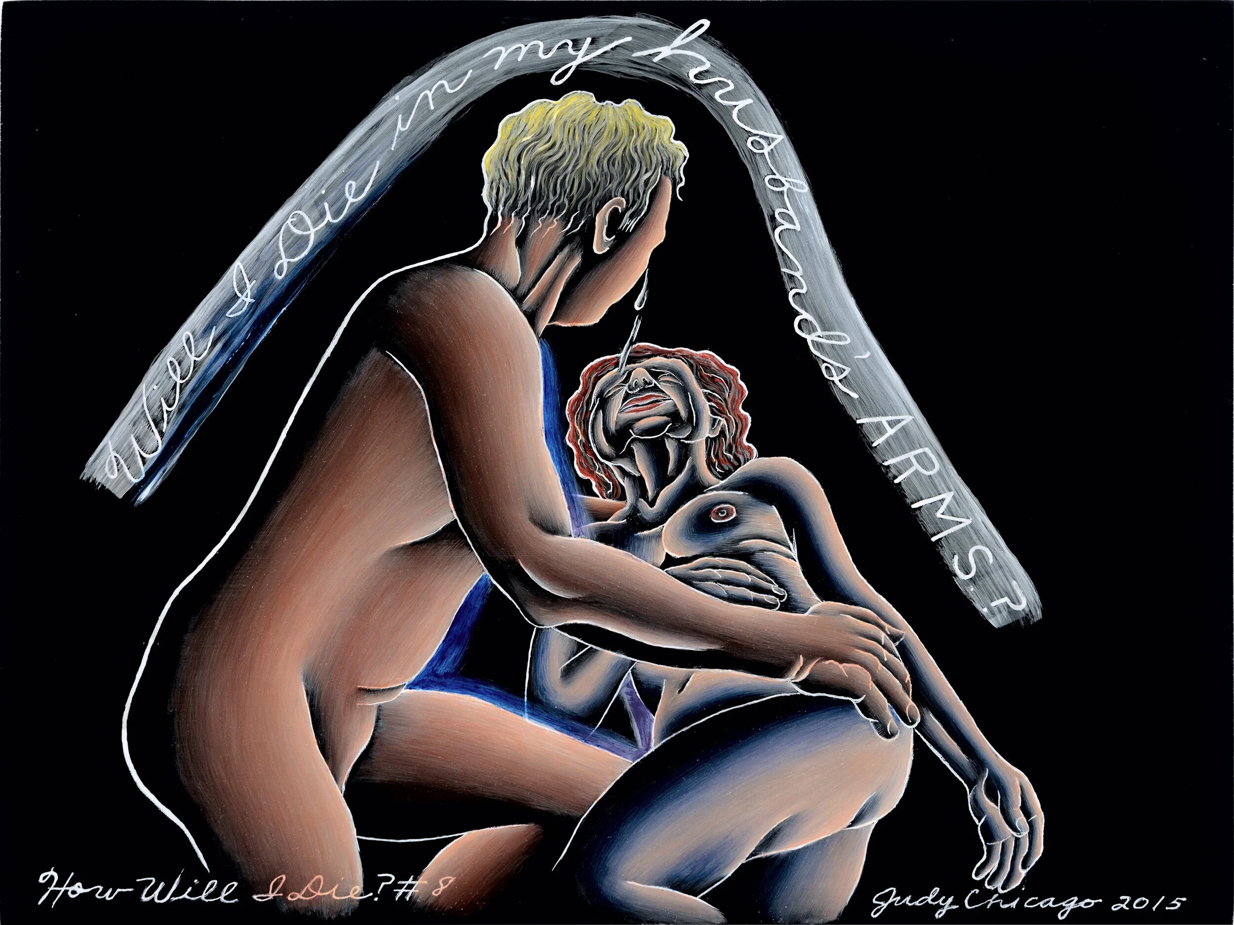 Judy Chicago, How Will I Die? #8, from The End: A Meditation on Death and Extinction, 2015; Kiln-fired glass paint on black glass, 9 x 12 in.; Courtesy of the artist; Salon 94, New York; and Jessica Silverman Gallery, San Francisco; © Judy Chicago/Artists Rights Society (ARS), New York; Photo © Donald Woodman/ARS, NY